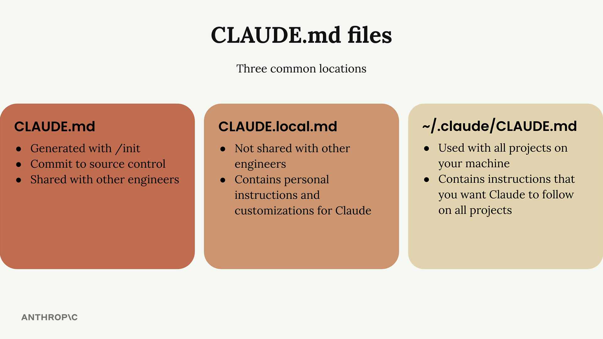 Claude Code会在三个常见位置识别三个不同意义的CLAUDE.md文件,如下图所示: