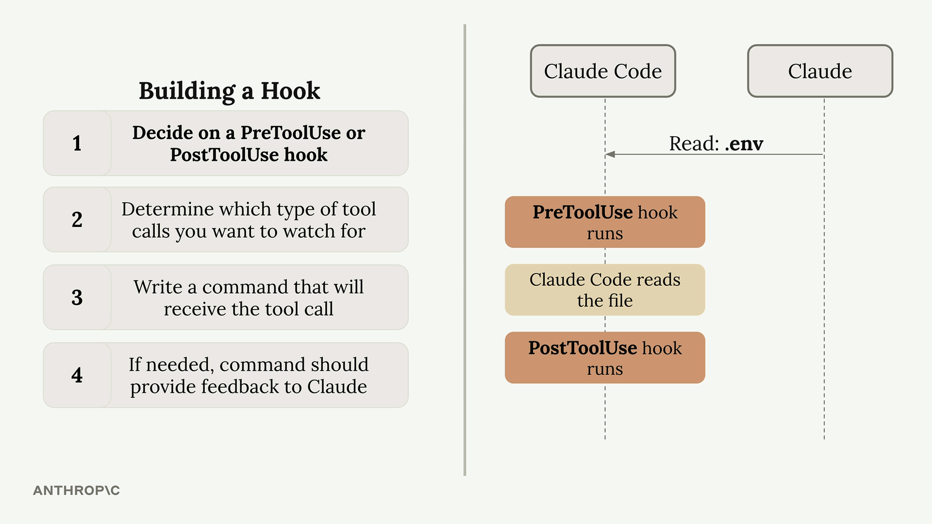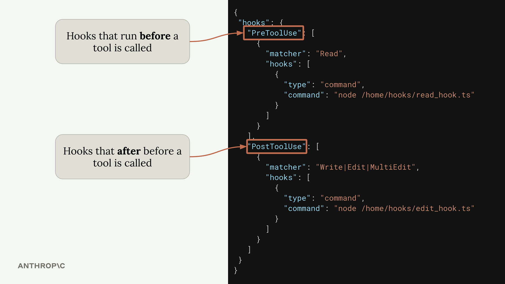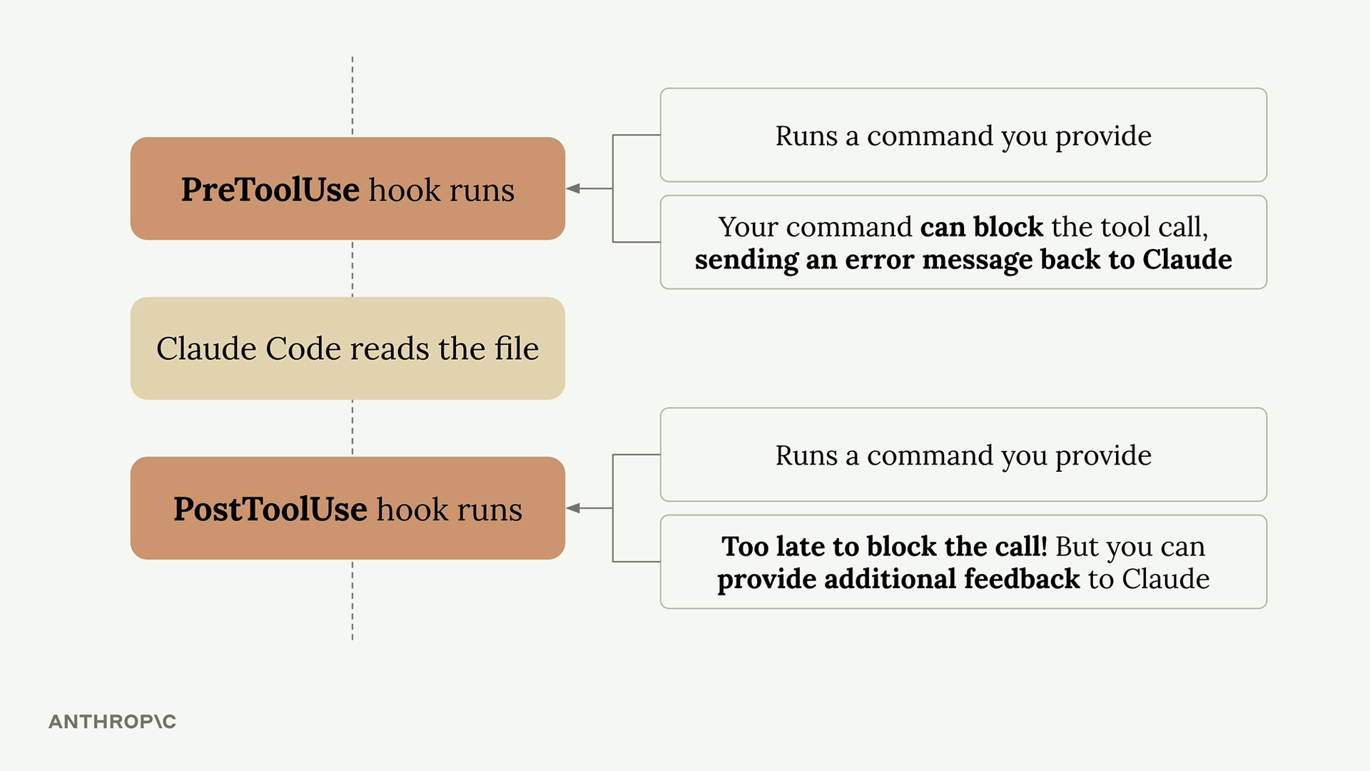 PreToolUse hooks 让你控制 Claude 能做什么,而 PostToolUse hooks则让你增强 Claude 已经做过的事情。