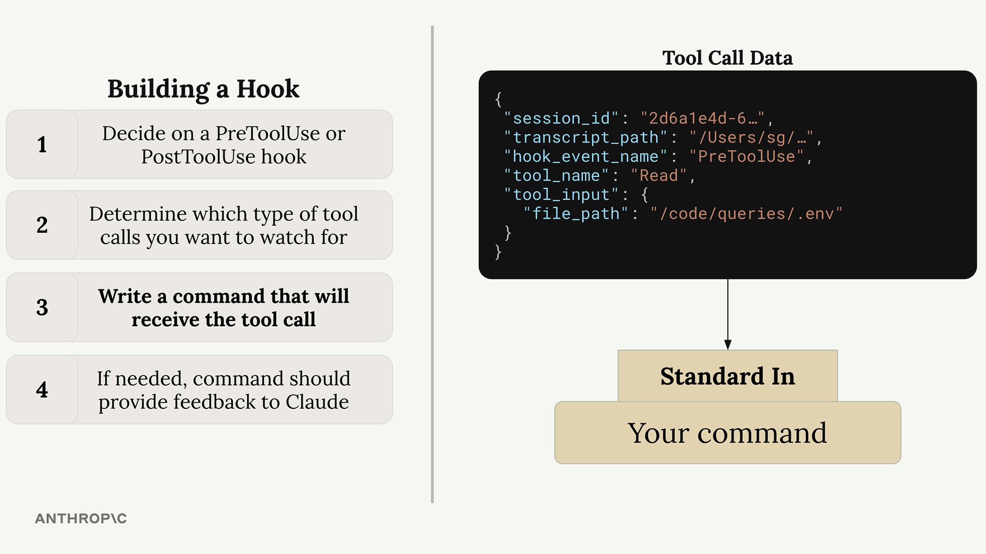 当Claude尝试使用某个工具时,hook会接收到来自标准输入的关于工具调用的信息(以JSON文件的形式)。具体来说,包括: