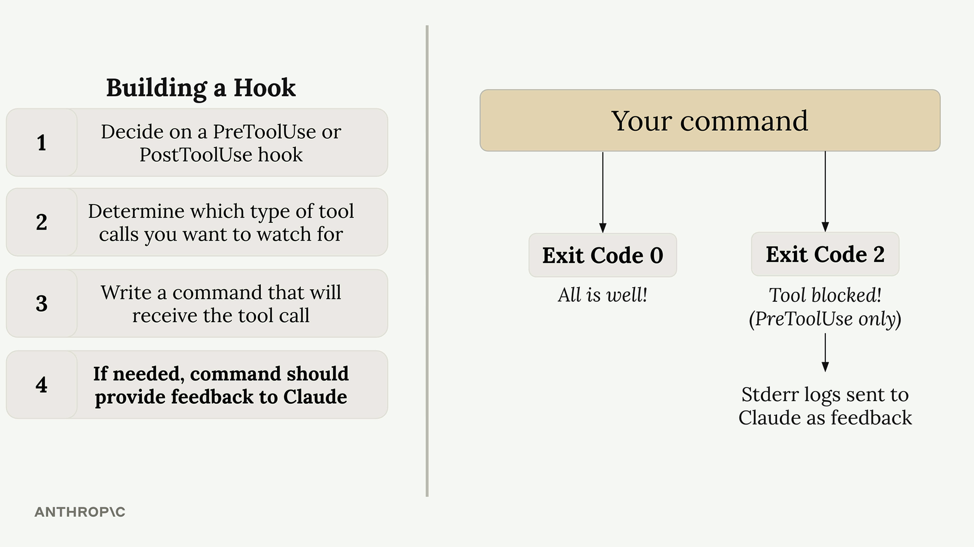 - 如果有必要,指令需要向Claude提供反馈 —— 指令通过exit code来告诉Claude是否运行或阻断特定操作