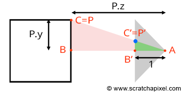 \[\frac{BC}{AB} = \frac{B'C'}{AB'}\]我们已知边$AB’$为$1$,并且已知$B$与$C$的值,分别为点P在相机空间中的Z坐标与Y坐标。代入等式,得: