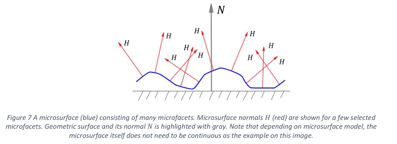 微表面理论将物体表面建模为由大量微表面组成的集合,这些微表面具有不同的坡度和高度(如下图所示)。微表面的变化程度和方式由微表面分布函数𝐷描述(通常依赖于粗糙度参数以控制表面外观)。这赋予BRDF特定的形状,从而影响材质的最终外观。