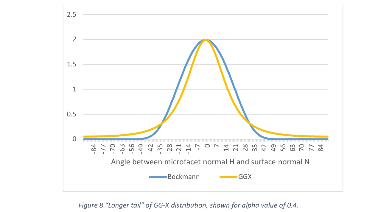 有多种不同的分布函数,例如Beckmann NDF,其使用直观的粗糙度参数(定义为微表面坡度的均方根斜率root mean square RMS)来控制其形状。另一个重要的NDF是GGX,与Beckmann相比,GG-X生成的镜面波瓣具有”更长尾部”,即高光峰值的衰减更缓慢(如下图所示),在掠射角处能够产生柔和的光晕。这更贴近许多实测的真实材质特性(例如金属边缘的辉光),因此GG-X被游戏行业广泛采用。此外,由于图形学界贡献的优化和近似方法,GG-X的计算通常更加高效。