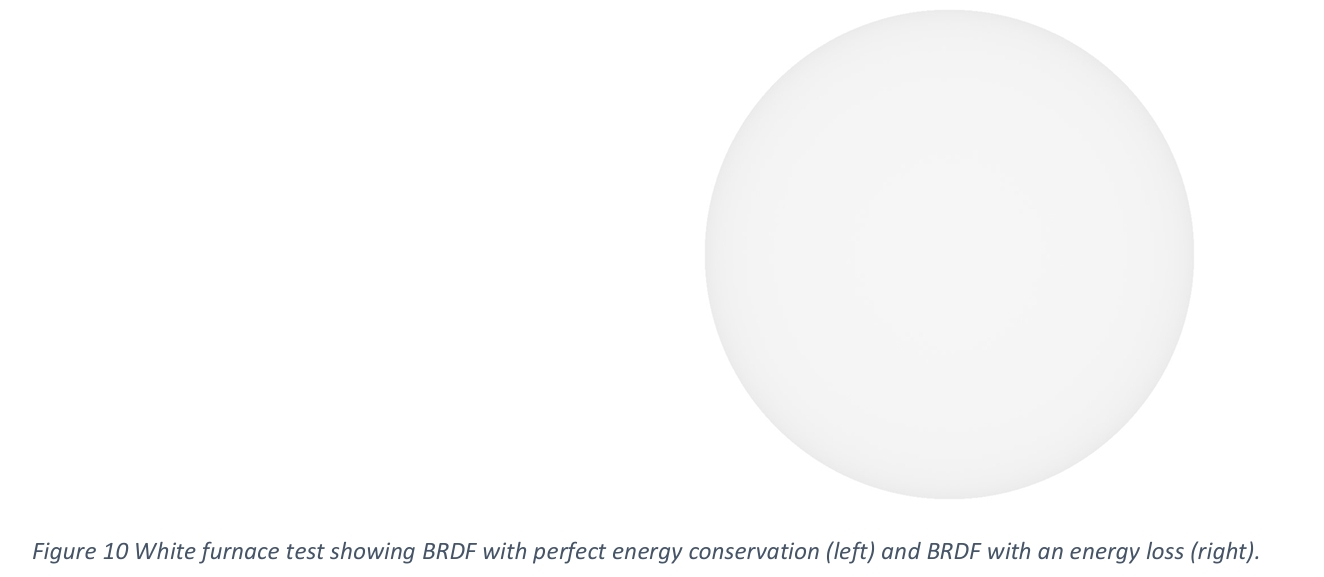 在构建实时渲染的材质模型时,能量守恒问题过去常被忽视,尤其是仅使用单次反射光照时。对于路径光线追踪和全局光照算法,必须确保光线从表面反弹时不会额外产生能量,否则路径追踪器的收敛性将无法保证。一种易于实现且实用的能量守恒测试是白炉测试,即在全方位白色光照下渲染一个白色球体。若材质遵守能量守恒,球体应完全融入白色背景中,如下图所示(图中有两个白球)。任何差异均表明存在能量损失或增益。由于球体渲染覆盖了所有可能的视线与光线向量组合,我们能清晰观察到能量异常发生的角度范围。