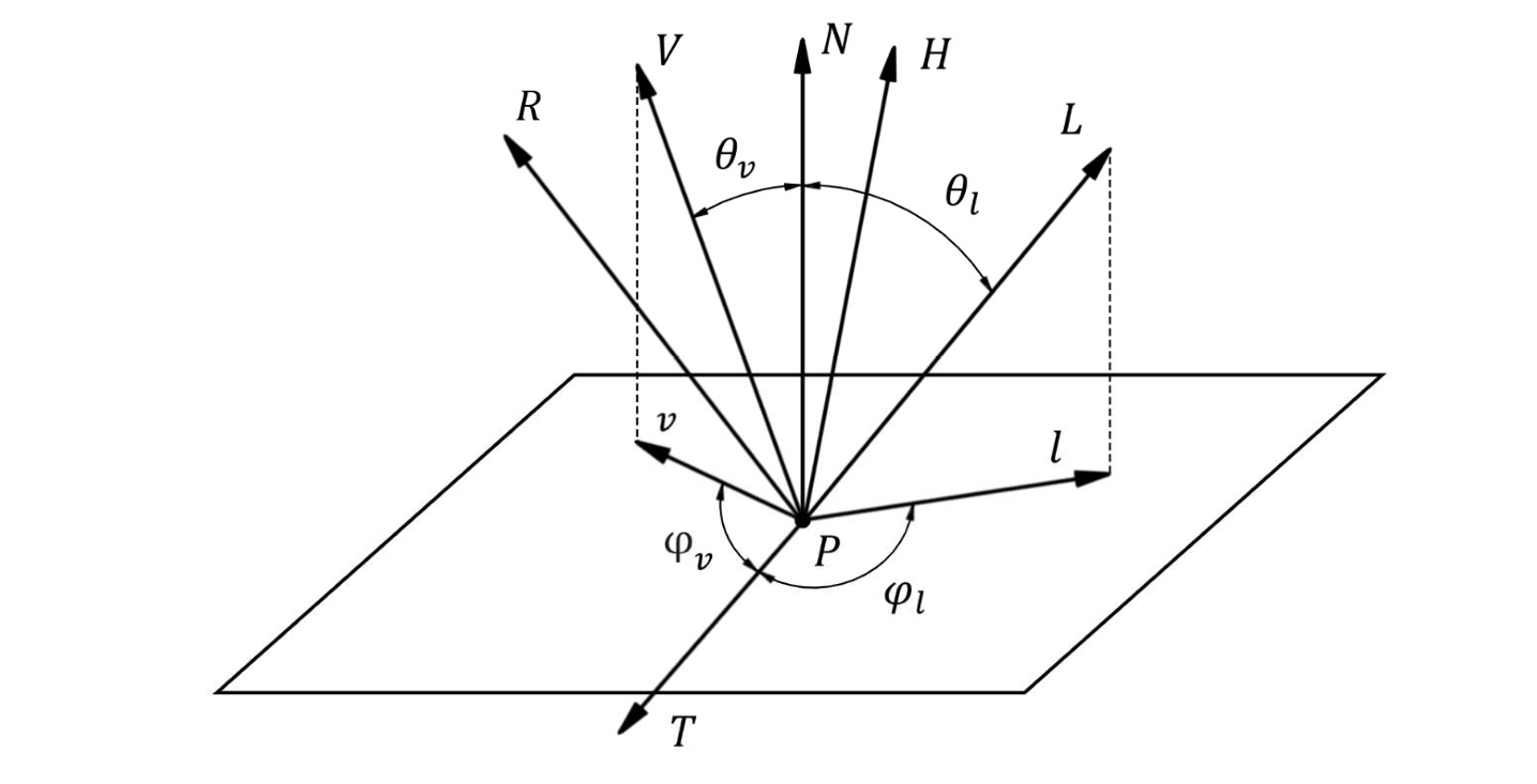 本节将重点解析经典基础BRDF模型——包括兰伯特(Lambertian)反射模型、冯氏(Phong)高光模型等,并建立统一的接口规范,为后续更复杂的BRDF实现提供即插即用替换模块的技术框架。在具体展开前,我们需借助下图明确定义若干关键几何向量(所有向量默认是归一化的):