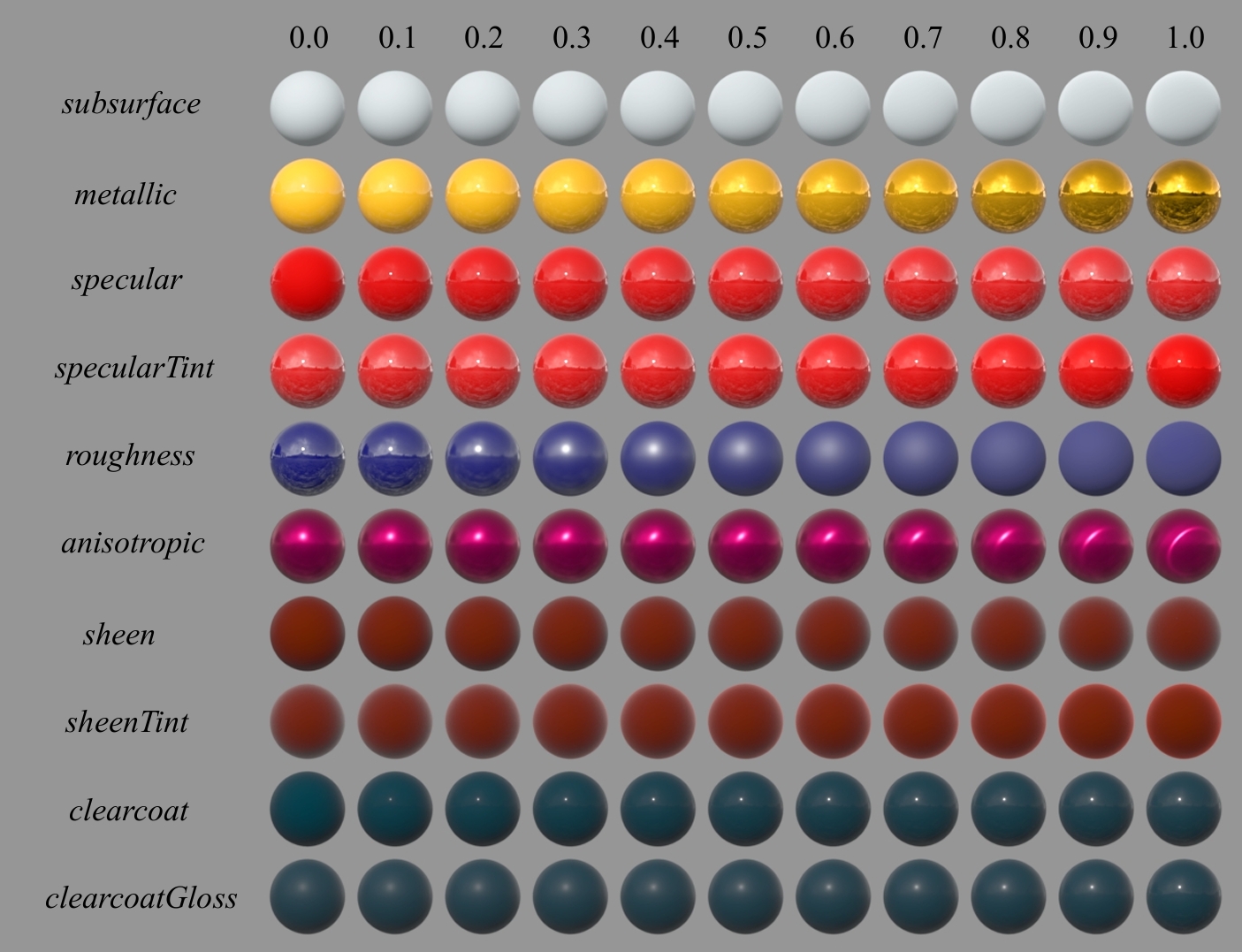 - sheenTint:布料光泽趋向基础色的着色强度
