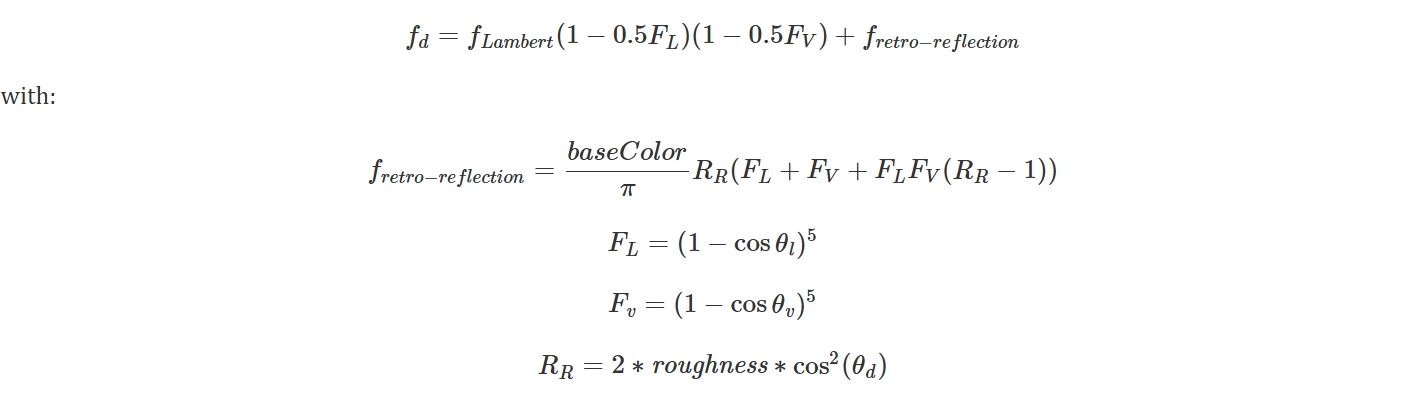\[f_d=\frac{baseColor}{\pi}(1+(F_{D90}-1)(1-cos\theta_l)^5)(1+(F_{D90}-1)(1-cos\theta_v)^5)\]其中,
