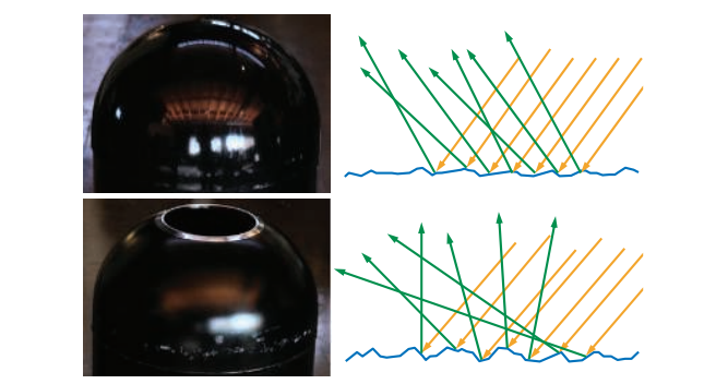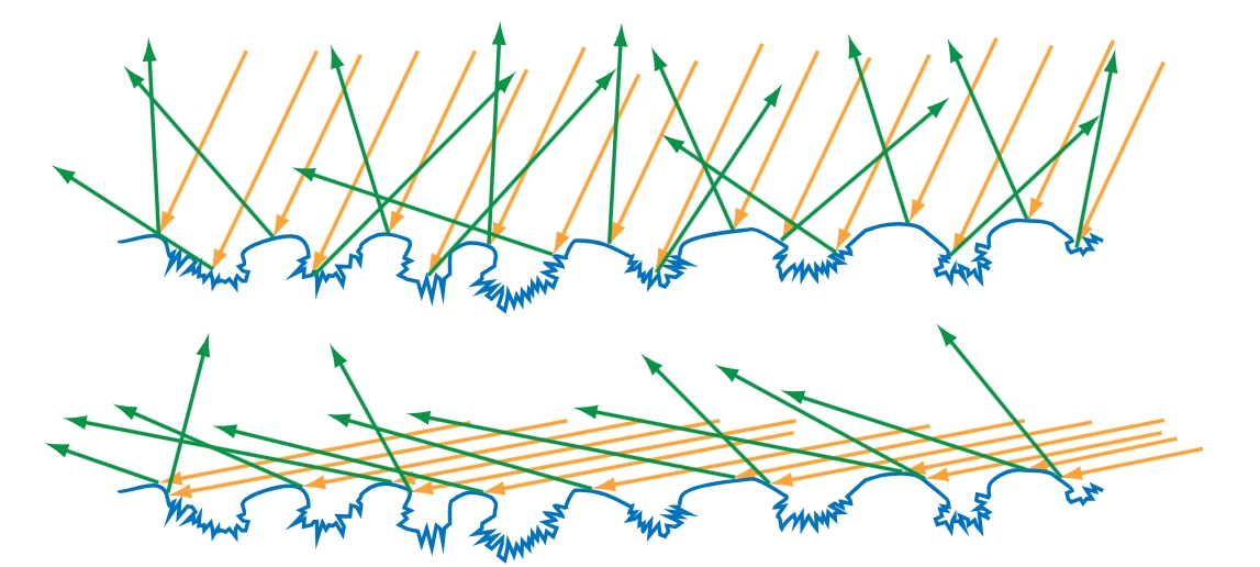 对于所有的表面而言,不规则表面的可见尺寸会随着入射角度$\theta_i$的增大而减小。在掠射角度下,这种效应可以将观察到的不规则表面的尺寸减小到小于光波长的程度,使得这些不规则表面对于光的传播没有任何影响。同时考虑到菲涅尔效应,最终会使得表面在掠射角度下具有很高的反射率。