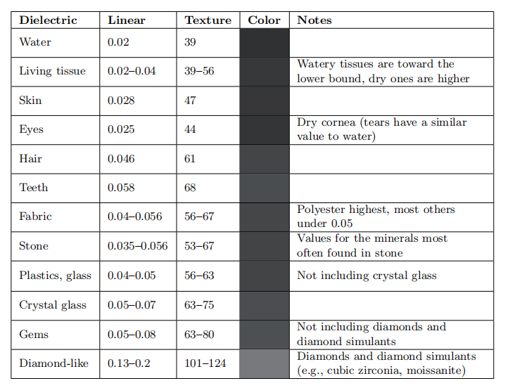 电介质的光学属性在可见光谱上变化很小,其结果就是电介质通常具有无色的$F_0$值。下表包含了一些常见电介质的$F_0$值,可以注意到,我们使用了标量值而非RGB值,这是因为电介质的$F_0$值在RGB通道中的差异几乎可以忽略。表中同样包含了非线性编码的8bit值以及对应的色板。