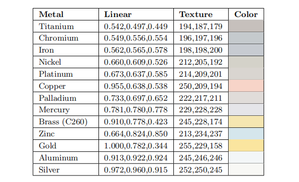 金属的$F_0$值通常较高,基于都大于等于$0.5$。同时,金属的光学属性在可见光谱上变化很大,其结果就是金属通常具有彩色的$F_0$值。