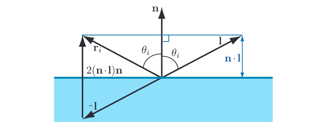 如上图所示,照射到平坦表面的光线会分为两部分:反射与折射。其中,反射角度与入射角度相等,反射向量可以通过法线向量与入射向量计算得到: