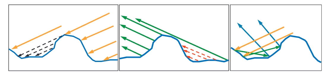 除了表面法线,还存在其他影响微观几何的反射率的因素。shadowing指的是光源被其他微表面所遮挡,masking指的是视线被其他微表面遮挡。下图中的左侧与中间分别示意了shadowing与masking,右侧是表示光线在微表面之间的相互反射: