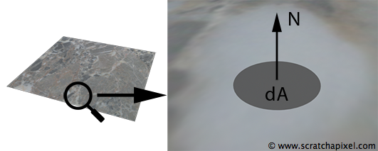 \[\text{material brightness} = \frac{\text{light reflected}}{\text{light received}}\]在现实世界中,物体材质属性在其表面上通常会有所不同。准确地来说,物体外观在其表面的空间上是可变的。大理石板是一个很好的例子。既然物体外观在其整个表面上是变化的,当我们要计算这样一块大理石所反射与接收的光通量时,我们需要对光通量这一概念建立更微观的理解:我们只考虑表面上单一一“点”上的光通量。但在现实世界中,我们无法定义这样一个所谓的“单一的点”,所以不妨转而考虑一个点周围非常小的区域——小到在该区域的面积上,物体表面具有一致的材质属性。或者说,在该小区域上,光通量不足以产生变化。我们将这个很小的面积区域称为differential area,记作$dA$。如下图所示: