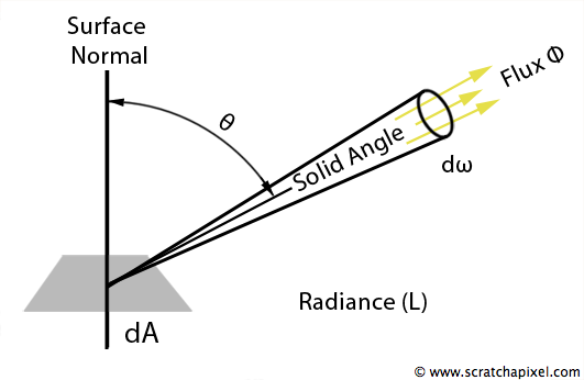 \[dE=cos(\theta)Ld\omega\]其中,$\theta$表入射角度,$L$表示入射方向上的radiance,$d\omega$表示入射方向上的差分立体角。
