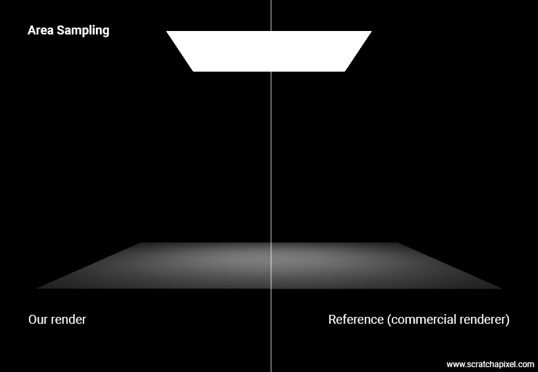 注意上述伪代码中,我们不再将光源视为具有自发光的几何体,而是从Light类派生的光源对象。因此,在大多数生产级渲染器中,面光源默认不会在图像中可见——它们不被当作几何体处理。代码中直接从光源获取其辐射能量(Le),并利用光源法线。t_max如前所述,存储了从着色点到光源采样点p_light的距离。光源表面采样点通过两个范围在[0:1]的随机数(伪代码中的r1和r2)计算生成,具体方法后续讨论。下图展示了此方法生成的图像效果。关于概率密度函数(pdf)的进一步解析将在后文展开。