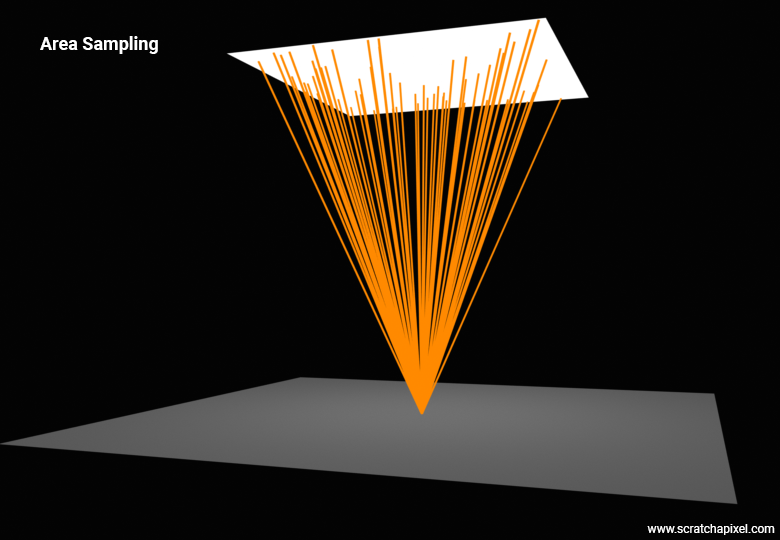 解决方案在于逆向思考问题:不再对半球方向进行采样,而是直接对面光源表面进行采样。如下图所示,我们不再沿法线方向在半球空间生成随机方向,而是在面光源表面均匀生成采样点(该方法通过在光源表面均匀分布随机位置实现)。随后,将这些采样点与当前着色点连线,得到对应的光照方向向量。
