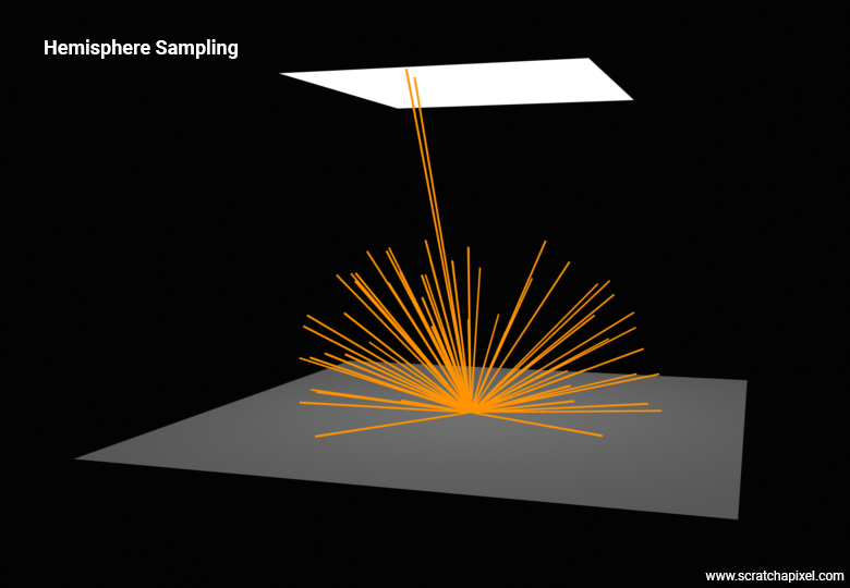 渲染方程通过积分半球方向上入射到某点的光线量来求解。被积函数(即需要积分的部分)表示从半球内所有可能方向到达该点的光能。我们使用蒙特卡洛积分法进行求解,这与前文解决“可见光源表面比例”问题的思路一致。具体实现时,通过在半球表面随机选取若干方向,沿这些方向发射射线,并检测其是否与光源(如面光源)相交。将每条射线返回的颜色值(若未与光源相交则为0,相交则为光源的辐射亮度)累加,再根据采样总数取平均值。下图展示了地面某一点的采样过程: