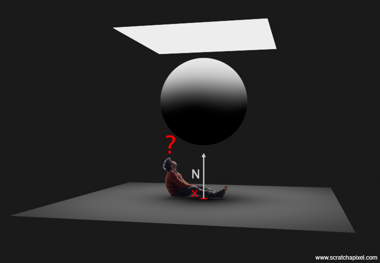让我们代入被区域光照明的点的视角。假设你就是下图中这个点,法线方向垂直向上,此时观察到的是一个球体部分遮挡了区域光表面。从这个视角不难推断:由于球体遮挡,仅有部分区域光发出的光线能到达你所在位置。