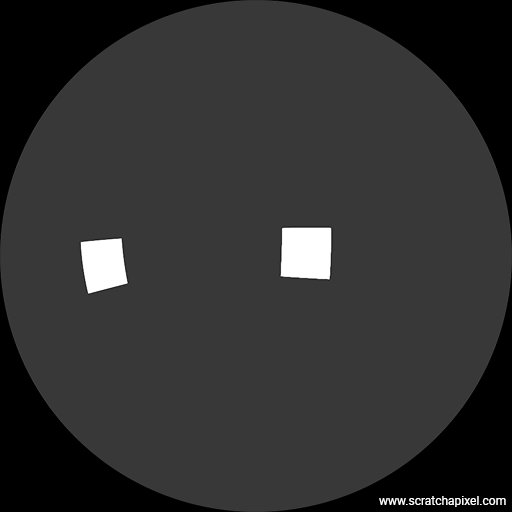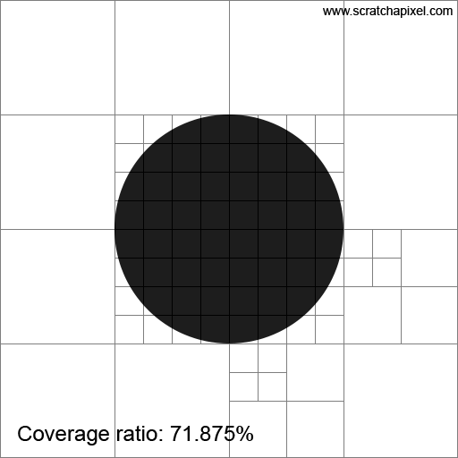 设想一张512x512像素的纯白底图,其中心位置有一个半径为128像素的黑色圆盘。这足以模拟我们前面所讨论的情景:从着色点视角观察到的区域光,其中黑色圆盘代表遮挡光源的球体。为解决遮挡计算问题,我们将采用辐射度启发式方法:沿两个维度递归细分图像,首轮划分生成四个象限。持续细分直至达到最大层级,或当前象限完全位于球体内/外。若象限同时包含黑白像素则判定为与球体重叠。最终统计纯白象限内的像素总数(排除与球体重叠或完全被遮挡的象限),将其除以图像总像素数即可获得光源未被遮挡的比例。