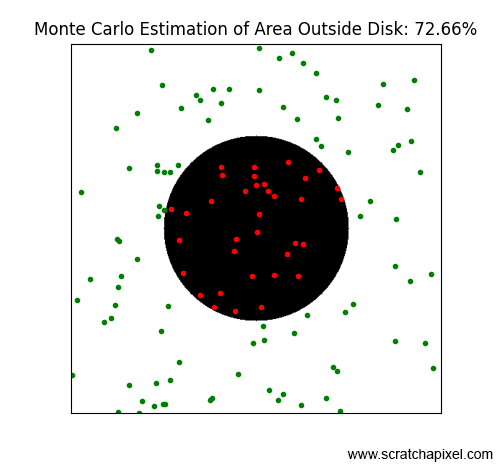蒙特卡洛积分法基于概率论,其核心思想是对区域光表面进行随机采样。若要计算某国成年人平均身高,测量全体人口显然不现实,但随机选取数千人测量后求均值即可获得统计意义上的合理近似。同理,我们可将此方法应用于区域光:想象向光源表面随机抛撒豆子(类比随机抽取人口样本),统计落在遮挡圆盘外(即从着色点可见区域)的豆子比例。数学实现非常简单:在512x512图像上生成随机点,判定各点是否位于球体外,统计可见点数量后除以总采样数。如下图所示: