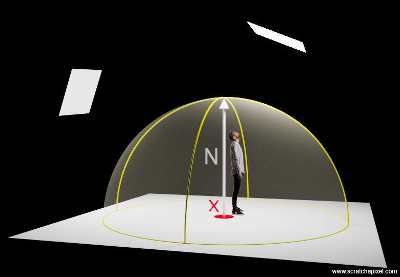 为深入探究区域光,我们需回溯计算机图形学中光照模拟的基本原理,由此引出渲染领域最重要的方程之一,渲染方程。本篇博客将仅讨论适用于仅漫反射表面的简化版本。该方程的原理并不复杂:假设你是一个着色点,下方为不透明表面,因此光照仅能来自上方空间。此时,以法线为轴的半球空间(如下图所示)囊括了所有可能入射方向的光线。在本示例场景中,着色点的光照来源于两个区域光。