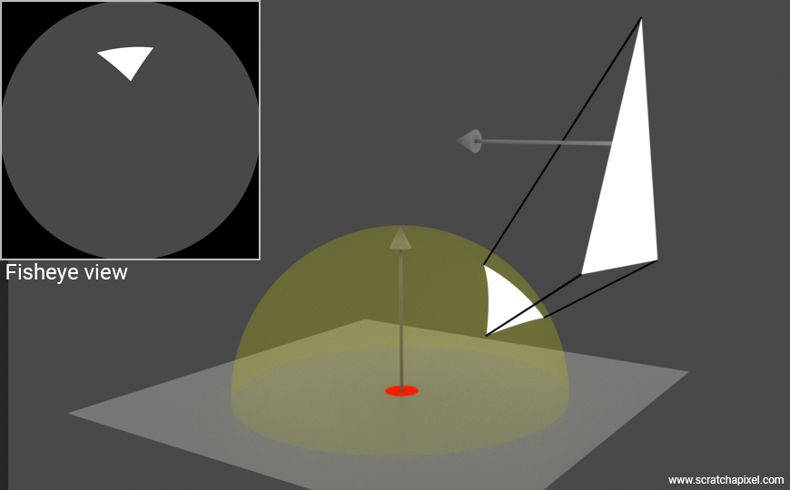 换种方式理解,可参考下图展示的从着色点视角出发的180度鱼眼视图。这本质上等同于该点”所见”场景,所有到达该点的光线均来自其”视野”范围。我们的任务是对该视图进行”扫描”并收集光线,但由于涉及连续空间,必须借助积分进行数学建模。