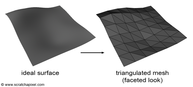 三角形网格体并不能完美地表示平滑的表面,除非构成网格体的三角形很小很小。如果我们使用三角形的face normal进行着色渲染,那我们得到的渲染效果就被称为flat shading:
