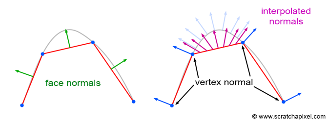 为了解决这种faceted appearance,Henri Gouraud提出了一种方法,不再计算每个面的法线,而是使用每个顶点上的法线,并通过线性插值来计算三角表面上任意着色点的法线。