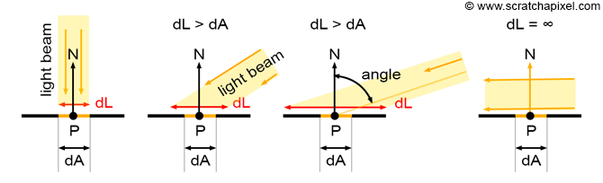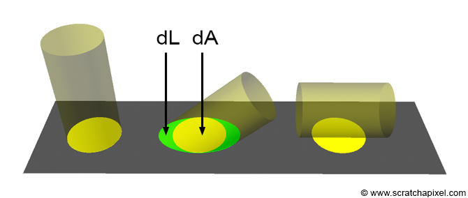 在任意给定时间下,我们可以假设达到$dA$的光量是一个常数。我们从图中可以看出,随着光束与法线之间的夹角变大,光束的横截面也在变大,那么光束中的只有部分能量是达到$dA$的。
