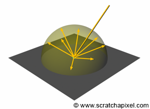 由于我们上述的这种性质,漫反射物体会被视为在以$P$为圆心,$N$为朝向的半球的所有方向上均匀地反射入射光线。如下图所示: