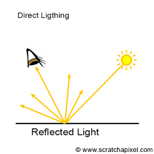 当我们看到“某个物体”时,我们实际上看到是物体表面所反射的光线:光线被光源发出,到达物体表面,此时物体会将部分光线反射到观察者所在的方向。在着色中,我们称这种光线为直接光照,如下图所示: