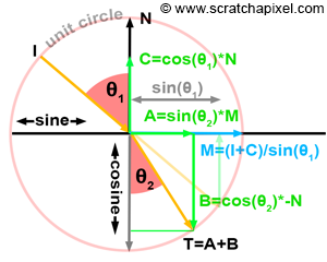 \[\frac{sin\theta_1}{sin\theta_2}=\frac{\eta_2}{\eta_1}\]现在我们的问题是,如何根据已知条件,推导出折射方向$T$呢?