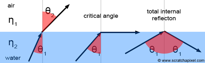\[\begin{array}{l} \eta = \dfrac{\eta_1}{\eta_2},\\ c_1 = \cos(\theta_1) = N \cdot I,\\ c_2 = \sqrt{1 - \left( \dfrac{n_1}{n_2} \right) ^2 \sin^2(\theta_1)} \rightarrow \sqrt{1 - \left( \dfrac{n_1}{n_2} \right) ^2 (1 - \cos^2(\theta_1))} \end{array}\]折射现象中还有一个需要我们注意的细节。在光线从IOR相对较低的介质到达IOR相对较高的介质的情况下,当入射角度大于某个被称为critical angle的临界值时,全部入射光线都会被反射,不存在任何折射。这种现象被称为total internal reflection。