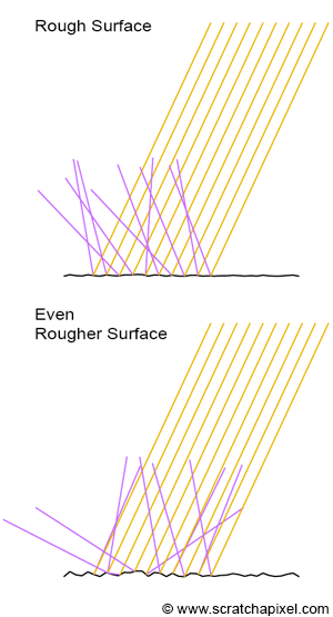 结果就是,光线会被散射到各个不同的方向上,而反射方向则取决于这些微小表面朝向的差异性。进而,反射的图像就会呈现出模糊的效果。换句话说,如果一个物体表面上的反射是模糊的,那就意味着该表面是粗糙的,它倾向于将光线反射到各个不同的方向上,而非镜面条件下一个单一的反射方向。
