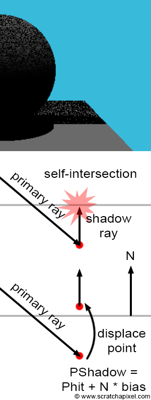 计算阴影有一个很普遍的问题就是shadow-acne。它出现的原因是3D引擎中有限的数字精度,进而导致导致primary ray与物体的交点位于表面下方。在这种情况下,指向光源的shadow ray就会与该物体自身的表面相交,即所谓的”self-intersection”,进而导致错误的阴影出现。如下图所示:
