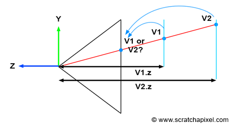 为什么我们需要保留相机空间中的Z值呢?试想,在场景中,如果两个顶点经过投影阶段处理后,具有相同的栅格坐标,那我们要如何决定哪个顶点是可见的呢?此时,如果我们比较两个顶点在栅格空间中的Z值,那么就有较小Z值的顶点一定距离相机更近,也就是可见的,而距离较远的顶点是不可见的。下图演示了Z值的重要作用