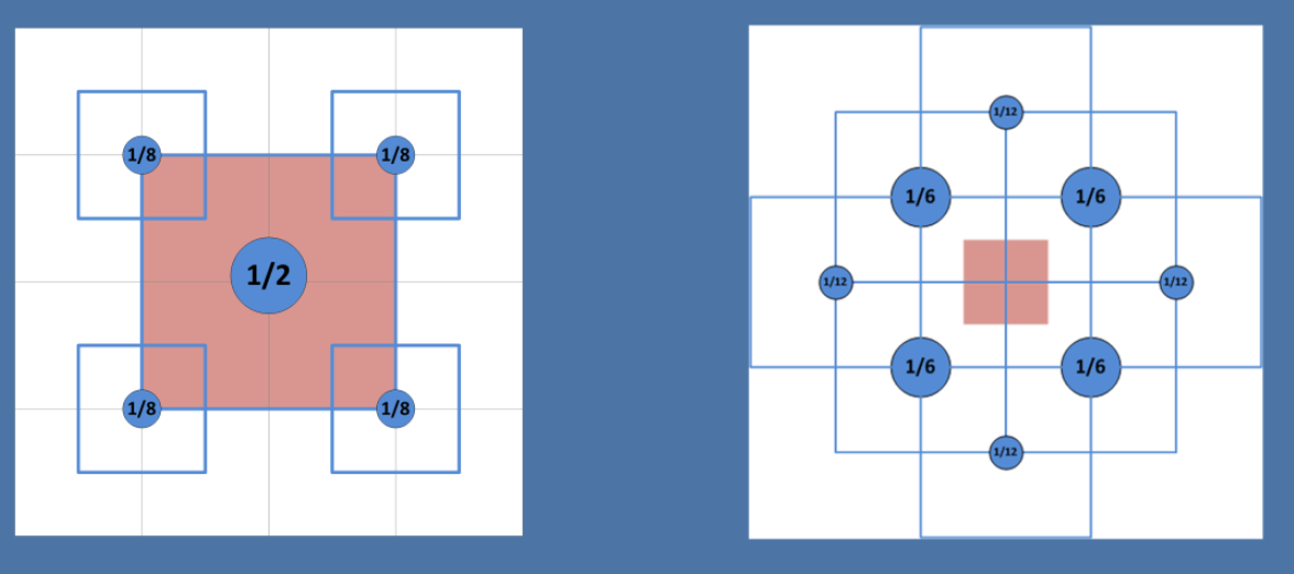 在Dual Kawase Blur算法中,降采样与升采样会使用不同的blur kernel,如下图所示: